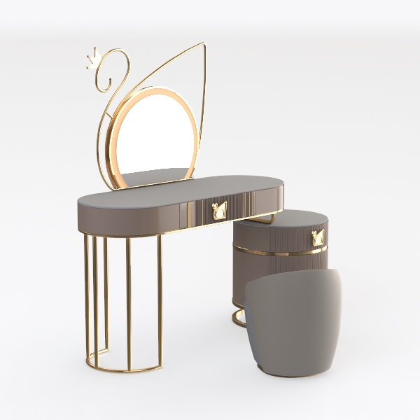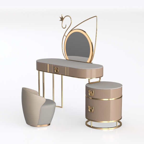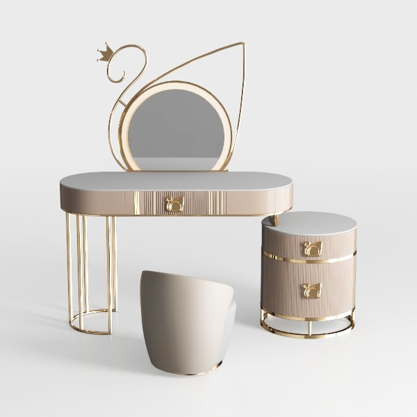 Inspired by swan grace, this vanity set blends smooth gold metal frames with soft blush and cream surfaces, boasting subtle textural details. It elevates modern-luxury bedrooms, pairing beautifully with marble accents and metallic decor. Spacious drawers and a compact stool add functionality, creating a cohesive, elegant space.