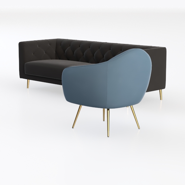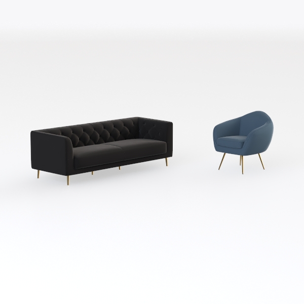 Drawing inspiration from mid-century modern furniture’s enduring appeal, this set merges nostalgic charm with contemporary minimalism. The black sofa features a tufted backrest that adds subtle depth, while its plush, velvety upholstery promises a soft, inviting touch—perfect for sinking into after a long day. Beside it, the powder-blue armchair, with its gently curved silhouette and delicate gold legs, creates a striking yet harmonious contrast, balancing the sofa’s boldness with a fresh, airy vibe.