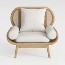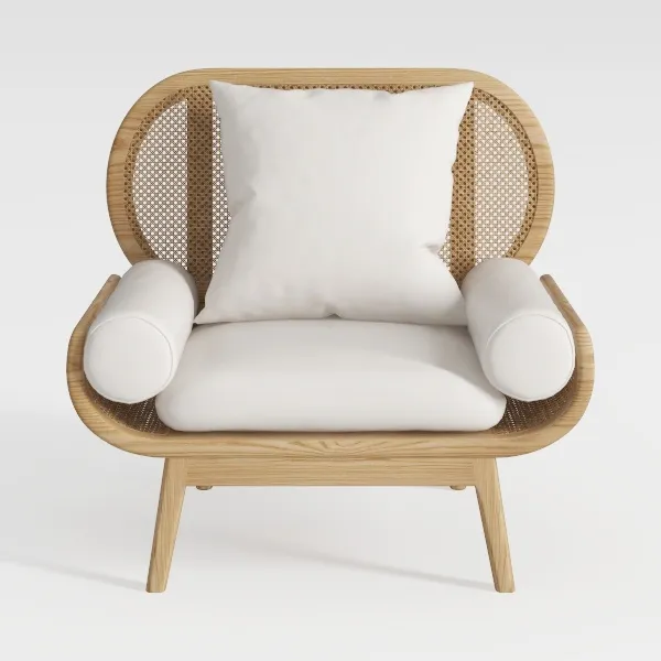 Visually, the chair balances structure and softness masterfully. The curved silhouette of the back and armrests—framed by the rattan’s open, lacy pattern—creates a gentle, approachable presence, while the natural wood frame, with its smooth, sanded surface and visible grain, adds tactile warmth. The seat and arm cushions, upholstered in a plush, off-white fabric, feel inviting to the touch, and the matching lumbar pillow enhances both comfort and visual cohesion.