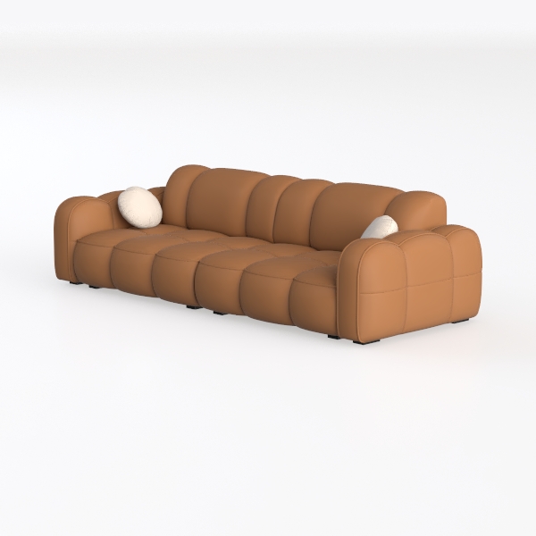 Visually, the sofa is a study in texture and form: a modular, block-like structure with softly rounded edges creates depth, while its upholstery feels buttery-soft yet structured, inviting a gentle touch that contrasts with its sleek silhouette. The cushions, generously sized and deeply padded, cradle the body, making every moment of sitting feel like a quiet retreat.