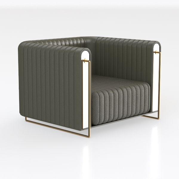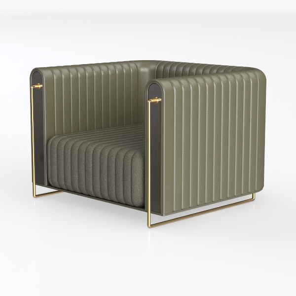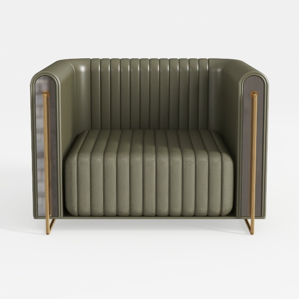 The seat and backrest feature a textured, ribbed upholstery in a rich olive green—soft to the touch, with a subtle sheen that catches light gently. The vertical ridges create a sense of height, making the chair feel airy and not overwhelming in smaller rooms, while the deep, padded seat offers plush, inviting comfort.