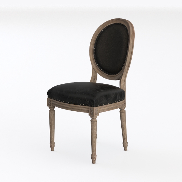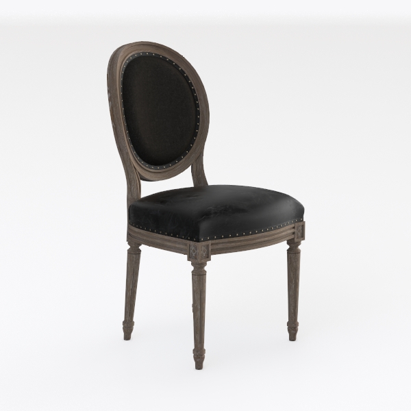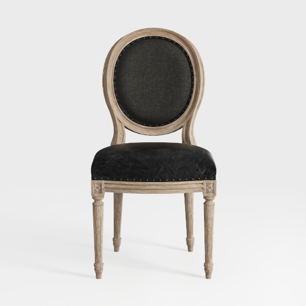 Inspired by classic French provincial design, this chair features a weathered oak frame with delicate carved details, exuding warm, rustic charm. Its black leatherette seat offers a smooth yet durable texture, while the oval backrest, studded with subtle nails, adds timeless elegance. Pair it with marble-topped tables and wrought-iron accents for a modern farmhouse or vintage industrial space. Sturdy, tapered legs ensure stability, and the padded backrest provides comfortable lumbar support for extended seating.