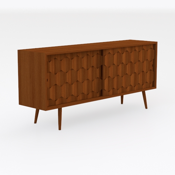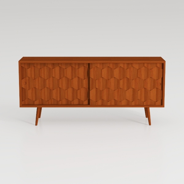 Inspired by natural geometric patterns like honeycombs, this wooden cabinet blends organic charm with modern simplicity. Its warm honey-hued wood features a textured hexagonal surface, offering smooth touch and rich visual depth. Perfect for a modern minimalist living room, it pairs beautifully with sleek sofas, geometric rugs, and potted greenery. Spacious storage behind sliding doors, supported by sturdy, tapered legs, balances style and practicality.