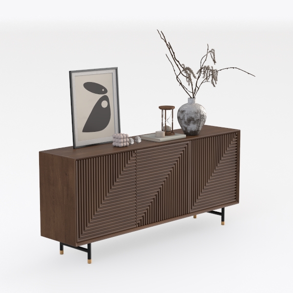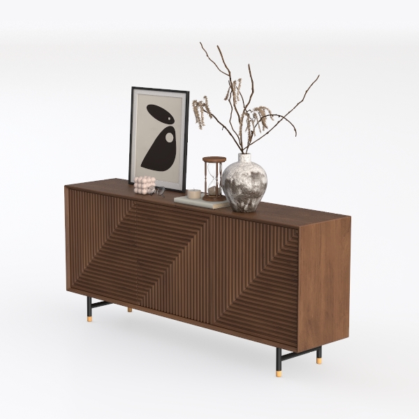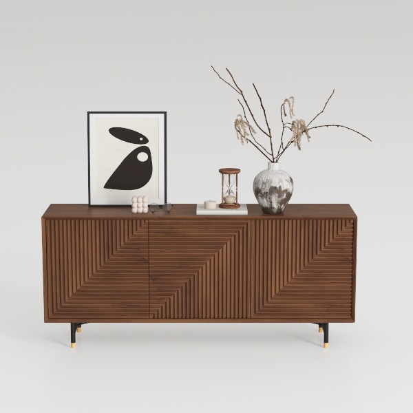 Inspired by organic geometric patterns, this wooden cabinet features warm, smooth textures and layered, angular lines, blending minimalist elegance with a warm, inviting visual vibe. Ideal for modern or Scandinavian living rooms, it pairs beautifully with neutral-toned decor and soft ambient lighting, while its spacious storage and sturdy gold-accented legs add both practical functionality and subtle charm.