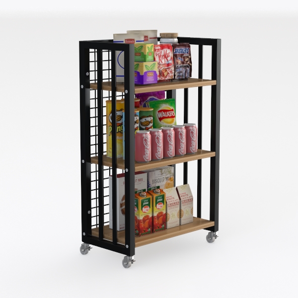 Inspired by modern minimalism, this rolling snack rack blends sleek black grid frame with warm wooden shelves, balancing style and utility. Layered design neatly holds snacks like KitKat, Snickers, Walkers, Coca-Cola cans, and biscuit mixes. Mobile base allows easy repositioning, perfect for living rooms, kitchens, or offices, adding a vibrant, practical touch to any space.