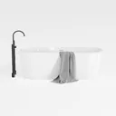 A modern white freestanding bathtub designed with a sleek profile and a black faucet, ideal for contemporary bathrooms, totaling 468040 polygons.