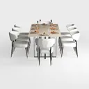 Inspired by blending natural wood warmth with sleek geometric lines, this dining set merges minimalism and subtle luxury. The wooden tabletop offers a smooth, warm touch, while the black metal frame adds crisp structure. White upholstered chairs with gold-accented legs bring softness, creating a clean, bright look. Perfect for modern minimalist or contemporary dining rooms, ideal for family meals or gatherings, complementing marble walls and metallic pendant lights. Wide tabletop fits multiple diners; comfortable chairs ensure long seating, blending style and practicality.