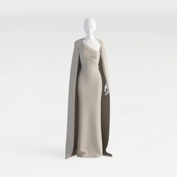 This elegant gown features a draped asymmetric neckline and flowing cape, rendered with 80073 polygons, ideal for fashion visualization projects.