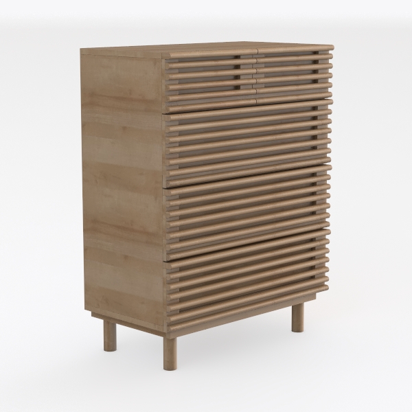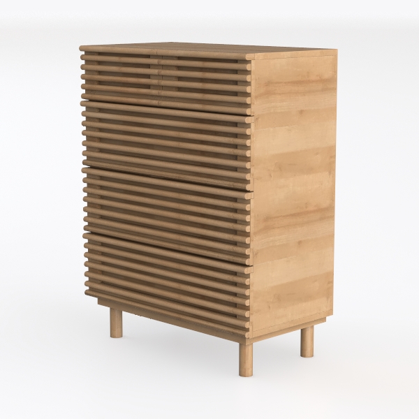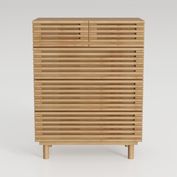 Inspired by natural wood grain and clean geometric lines, this cabinet features a warm, matte wooden surface with stacked slats, creating a soft, tactile texture and balancing minimalism with organic charm. Ideal for Scandinavian or Japanese-inspired bedrooms, it pairs beautifully with linen beddings and potted plants. The multi-drawer design offers ample storage, while slender, tapering legs add stability and lightness to the space.