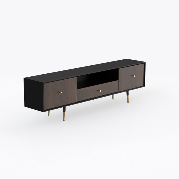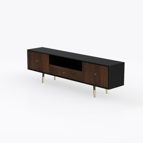 Inspired by mid-century modern design, this media console blends warm walnut wood grain with clean lines. Its rich, smooth matte surface contrasts beautifully with polished metal legs, creating a sleek, balanced look. Ideal for modern minimalist or Scandinavian living rooms, it pairs with neutral sofas, marble coffee tables, and brass lamps. Spacious drawers and cabinets offer ample storage, while slim legs keep the space light and uncluttered.