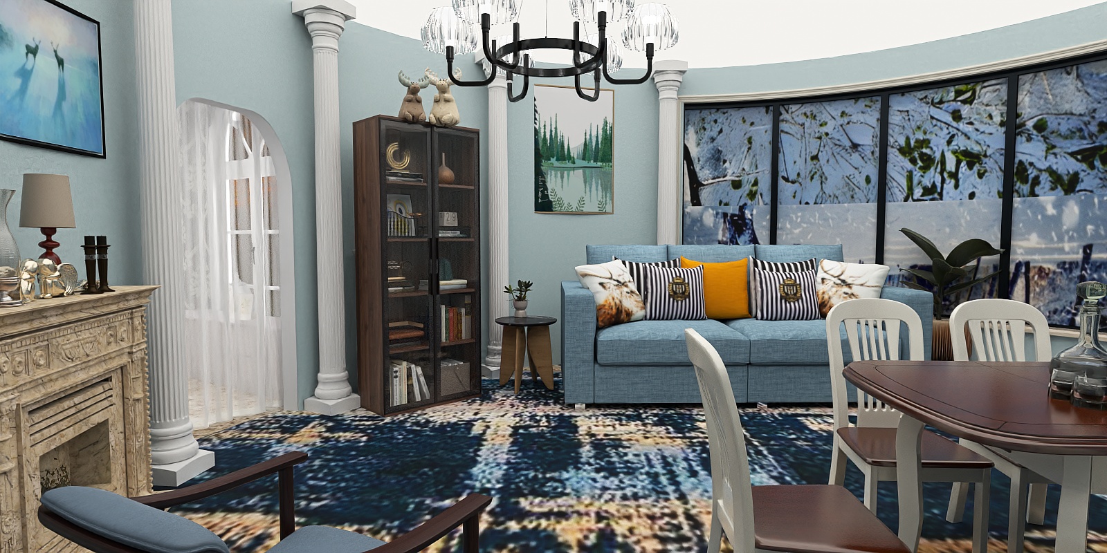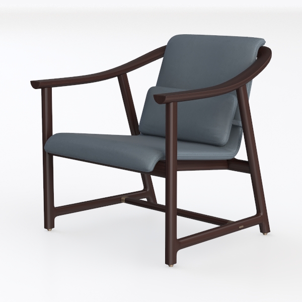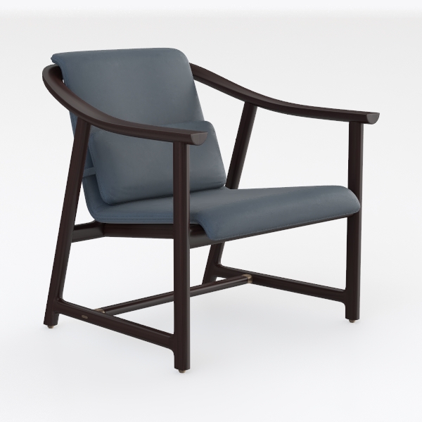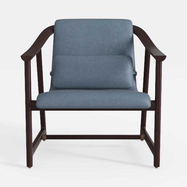 Blending Scandinavian minimalism with organic warmth, this armchair draws inspiration from the harmony of natural materials and clean lines. Its design reimagines classic armchairs, balancing geometric precision in the frame with soft, flowing upholstery contours. The frame, crafted from richly grained dark wood, offers a warm, tactile contrast to the light, textured upholstery—a muted blue hue that evokes calm and comfort. The fabric feels surprisingly supple to the touch, with a subtle weave that catches light gently, while the wooden arms curve invitingly, their smooth finish offering a satisfying grip.