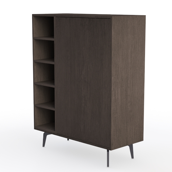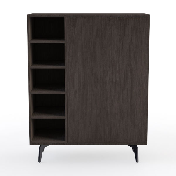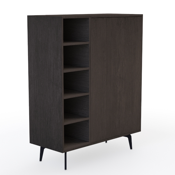 Inspired by organic wood grain and minimalist Scandinavian design, this cabinet blends warmth with clean lines. Its smooth, dark wood surface offers a tactile, warm feel, while the sleek profile adds modern appeal. Perfect for a modern living room or study, it pairs beautifully with light walls and metal accents. Open shelves display decor, closed compartments store essentials, and slender black legs elevate the space.