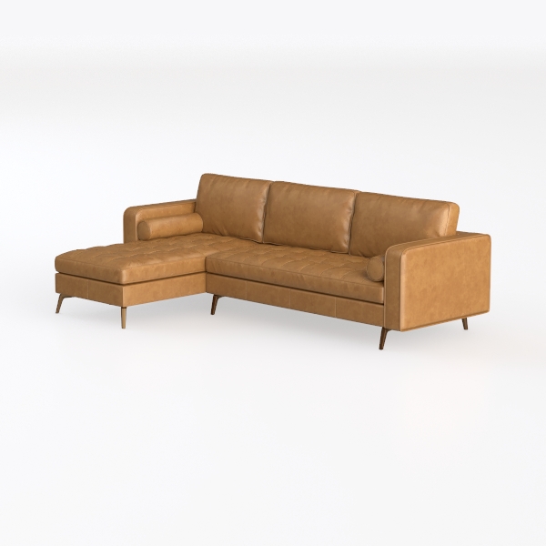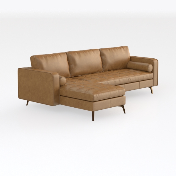 This elegant L-shaped sofa embodies a harmonious blend of mid-century charm and modern practicality, rooted in a design philosophy that prioritizes both aesthetic allure and everyday usability. Crafted from rich caramel leather, its warm, sunlit hue evokes a sense of coziness, while the buttery-soft texture invites tactile comfort—smooth to the touch yet surprisingly durable, making it ideal for both casual lounging and frequent gatherings. The subtle sheen of the leather catches light gently, enhancing the sofa’s sleek, angular profile, where clean lines meet a classic tufted pattern on the backrest and seat, adding understated visual depth without clutter.