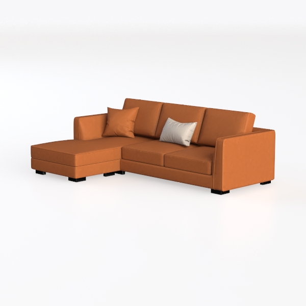 Inspired by the warm, earthy tones of golden-hour sunsets, this L-shaped sofa blends organic warmth with contemporary minimalism. Its design draws from the desire to create a cozy yet sophisticated focal point, balancing soft curves with clean, uncluttered lines to adapt seamlessly to various living spaces. The rich terracotta upholstery feels luxuriously soft and velvety to the touch, inviting relaxation, while the warm orange hue infuses the room with a gentle glow. Sleek, low-profile arms and tapered black legs add a modern edge, keeping the overall look visually grounding and subtly elegant.