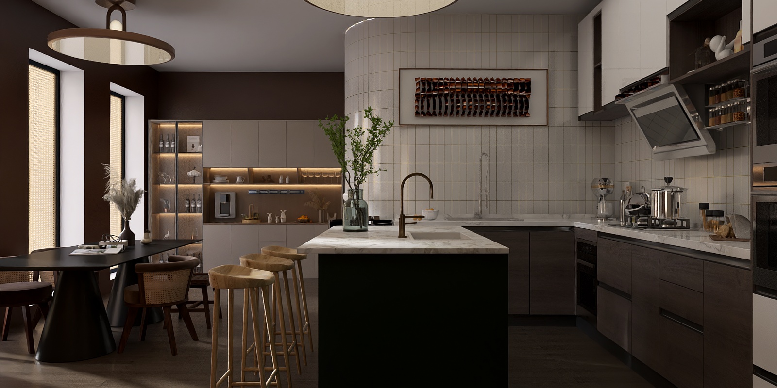 Inspired by natural geometric lines, this piece features a sleek black tabletop and textured black base, paired with woven chairs and a small stool. Its clean, monochrome palette with warm wood tones creates a sophisticated, minimalist vibe. Perfect for a modern dining or living space, it complements marble accents and metal light fixtures. The spacious top and comfortable seating offer both style and functionality for daily use.