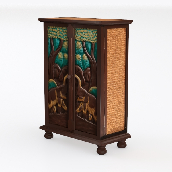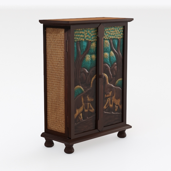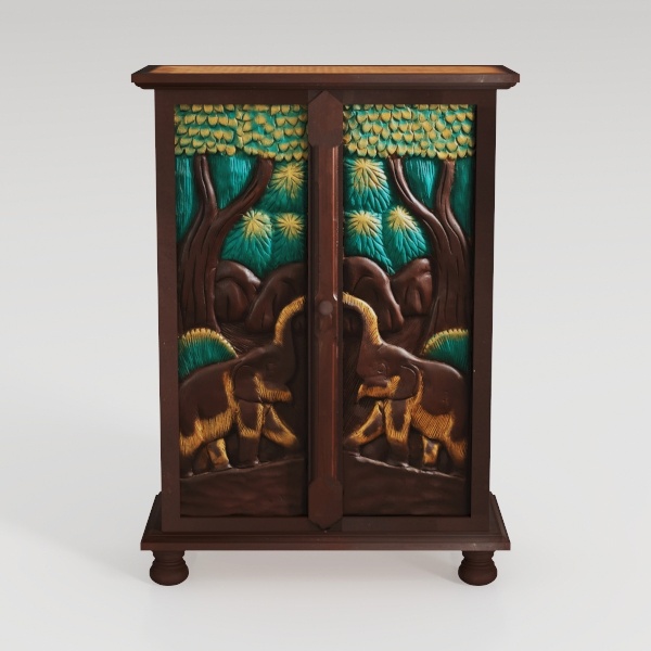 Inspired by lush natural landscapes and traditional animal motifs, this wooden cabinet features intricate carved elephants and trees. Its warm brown frame, vibrant green foliage, and golden elephants create a textured, layered look with artisanal charm. Perfect for tropical, bohemian, or vintage spaces, it pairs beautifully with woven decor and potted plants. With dual doors, it offers hidden storage for books or decor, blending aesthetic appeal with practicality.