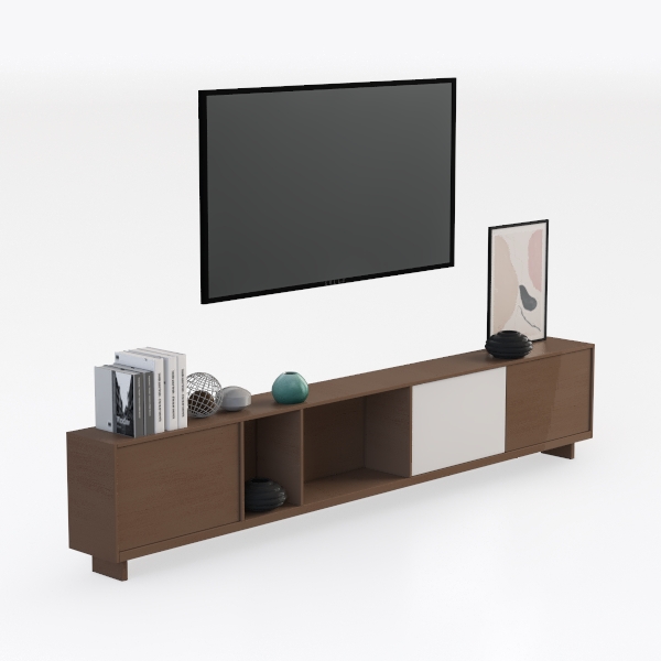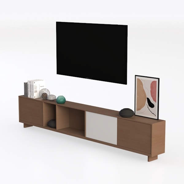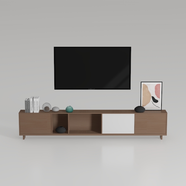 Inspired by warm natural wood tones and clean geometric lines, blending functionality with subtle organic charm. Smooth, warm wood grains create an inviting tactile feel, while balanced open/closed storage adds depth without clutter. Ideal for modern minimalist living rooms, it pairs with matte black accents, soft pastels, and abstract art, elevating the space’s serene, sophisticated vibe. Spacious open shelves and closed compartments offer flexible storage for media, books, decor; sturdy legs ensure lightness and easy cleaning.
