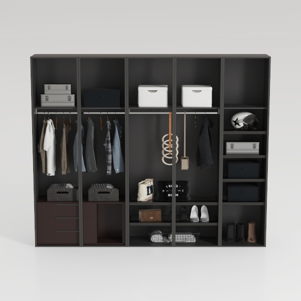 Designed for clutter-free organization, inspired by minimalist principles, this wardrobe features a matte black frame that oozes sleekness. Smooth drawers and crisp white storage boxes add contrast, creating a modern, clean look. Perfect for a contemporary master bedroom, it pairs with warm wood accents and soft lighting, enhancing calm sophistication. Ample hanging space, deep drawers, and divided compartments ensure efficient storage for clothes, shoes, and accessories, blending style and practicality.