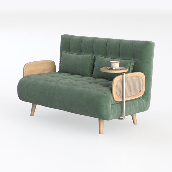 Beyond its aesthetic appeal, the design prioritizes functionality: the generously padded seat offers deep, cloud-like comfort, ideal for curling up with a book or hosting small gatherings. The integrated small side table, with its curved wooden surface, provides a handy spot for a morning latte or a remote, eliminating the need for bulky end tables and keeping the space open and uncluttered. Every detail, from the soft fabric to the natural wood, works in harmony to create a piece that feels both inviting and intentional—where style meets everyday ease.