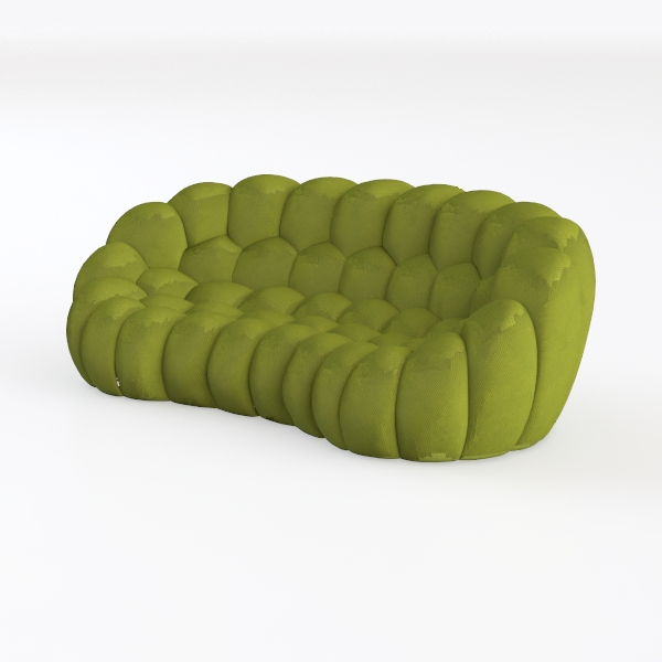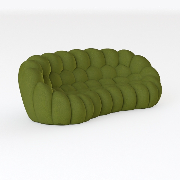 The sofa’s charm lies in its tactile and visual allure. The mossy green upholstery—warm yet muted—feels surprisingly sumptuous, with a velvety texture that contrasts beautifully against its raised, petal-like panels. These sculptural elements yield slightly when touched, offering a satisfyingly soft yet supportive feel, while their rhythmic pattern catches light subtly, adding depth to the design and making the sofa feel both bold and inviting.
