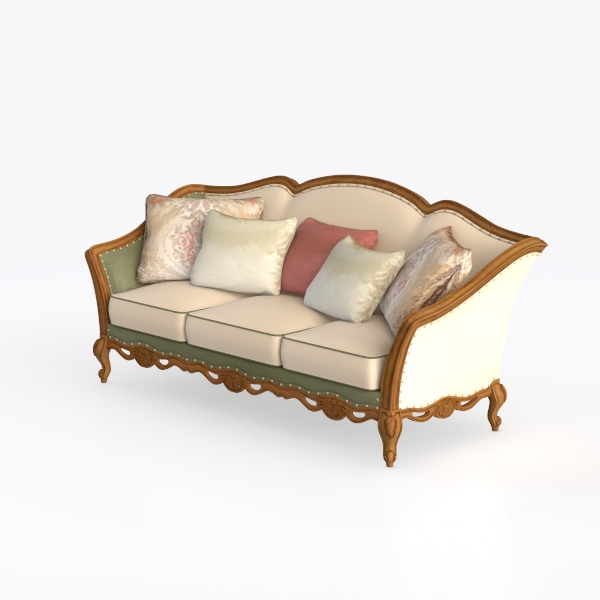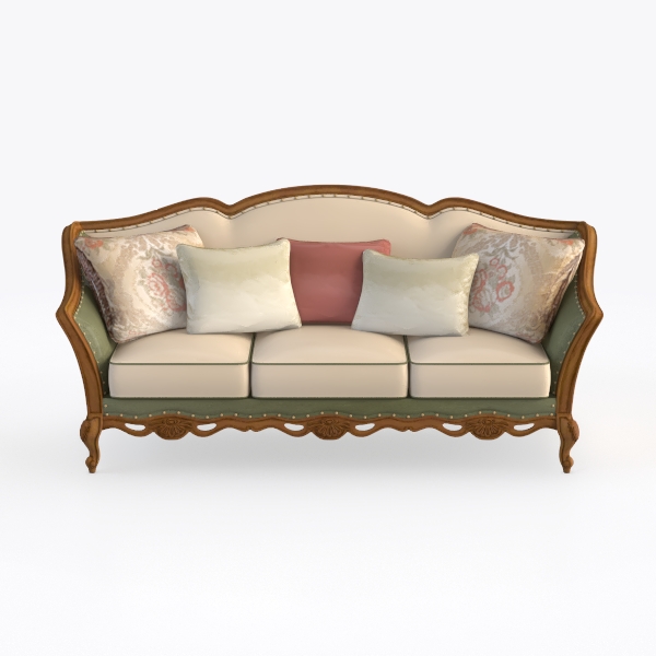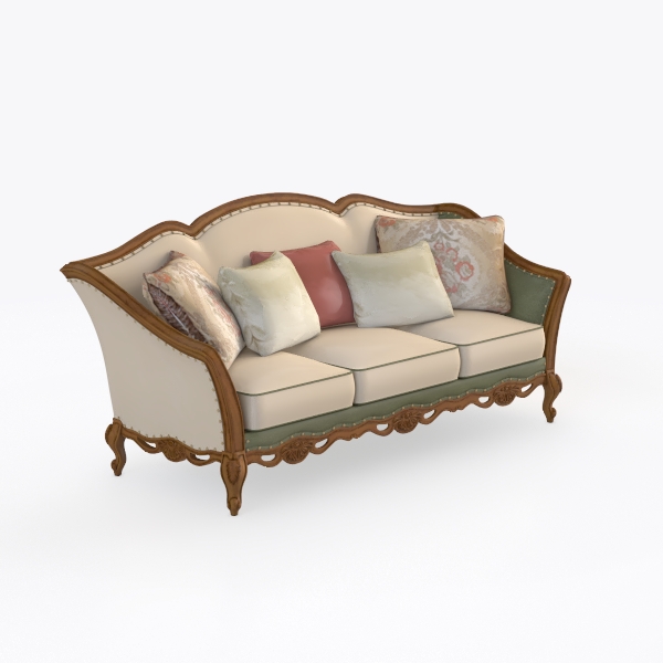 Inspired by the timeless elegance of 18th-century European craftsmanship, this sofa marries classic design with modern comfort. Its gently curved wooden frame, adorned with intricate floral carvings, exudes warmth and sophistication, while the soft, neutral upholstery—featuring off-white and sage green tones—creates a serene, inviting atmosphere. The plush, padded cushions feel luxuriously smooth to the touch, and the subtle nailhead trim along the edges adds a touch of refined detail.
