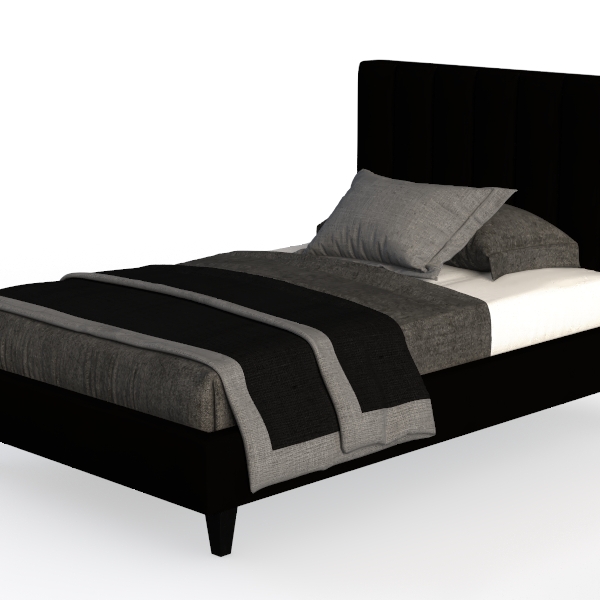 Inspired by minimalist elegance, this bed blends clean lines with monochromatic calm. Its velvety black headboard offers soft, plush touch; textured gray striped bedding adds depth, crafting a sleek, sophisticated look. Ideal for modern or contemporary luxury bedrooms, it pairs with matte black nightstands and warm wood accents. Sturdy frame ensures stability, supportive headboard enhances comfort, making it a restful centerpiece.
