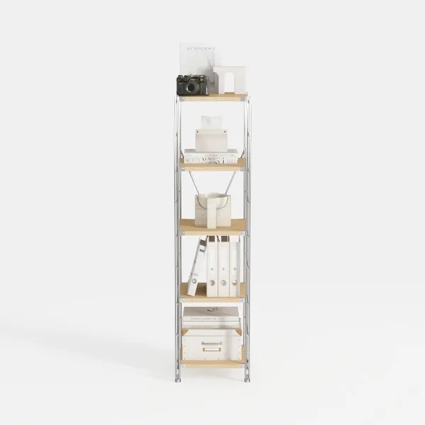 Inspired by the blend of industrial minimalism and functional design, this piece embodies a practical yet aesthetic approach to storage. The sleek, matte metal frame—polished to a subtle sheen—forms a lightweight yet sturdy structure, while the warm, light oak shelves, with their smooth, sanded finish and visible wood grain, add a touch of natural warmth. The clean, staggered lines create a balanced visual rhythm, making it feel both substantial and unobtrusive in any space.