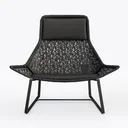 Inspired by geometric precision, blending architectural lines with organic patterns, this chair has intricate cut-outs on the backrest—lightweight yet structured. The smooth black leather seat contrasts with the cool, woven metal frame, offering soft touch and breathability. Perfect for modern minimalist living rooms, it pairs with marble coffee tables and sleek floor lamps, elevating contemporary spaces. Its wide, curved seat ensures long, comfortable relaxation with balanced support.