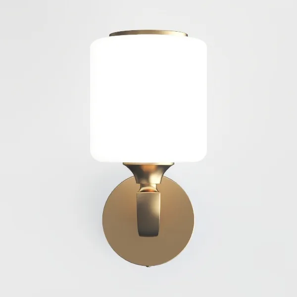 A 3D model of a Wall Lamp, featuring white cylindrical glass shade and gold metal base/holder, with a modern minimalist aesthetic. It has low-poly details and smooth surfaces, suitable for interior decoration like bedroom or living room lighting.