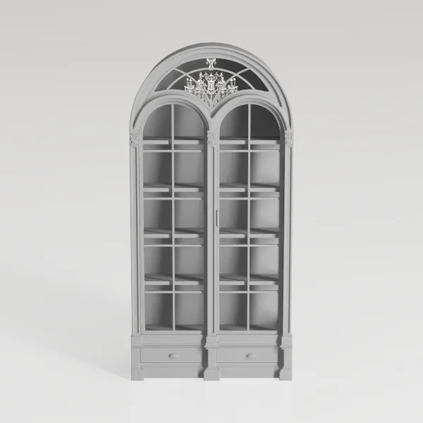 Inspired by classic European architecture, blending timeless elegance with modern minimalism, this arched display cabinet features smooth wood grain, clear glass doors, and ornate top detailing for subtle luxury. Ideal for a vintage living room or study, pairing beautifully with marble side tables and gilded frames. Spacious open shelves and two lower drawers offer ample storage, balancing display space with practicality.