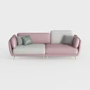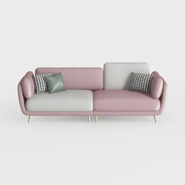 This sofa embodies a harmonious blend of contemporary design and cozy comfort, drawing inspiration from soft, organic elements. Its muted blush and soft gray upholstery mimics the gentle tones of dawn light filtering through mist, creating a warm, inviting atmosphere. The curved armrests and gently rounded corners add a touch of softness, while the warm gold legs elevate the design with subtle elegance, balancing sturdiness with lightness.