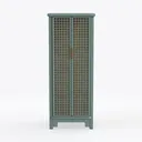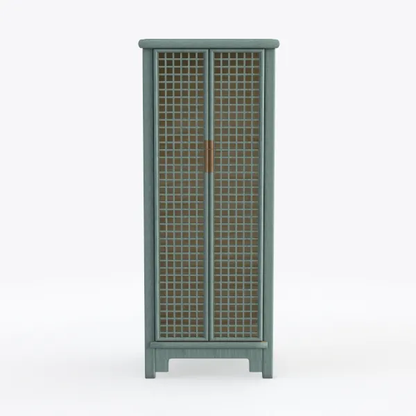 Inspired by traditional Asian latticework, the muted teal cabinet features smooth wood texture, with light-filtering, geometric grid doors that exude elegance and serenity. Ideal for a minimalist East-meets-West living room, pair with natural stone side tables and linen sofas. Two grid doors reveal ample storage, perfect for organizing books or decor.