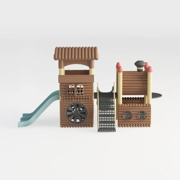 A 3D model of children's playground equipment, featuring log cabin structure, slide, rotating wheel, train locomotive design, and plastic materials, with a playful aesthetic. It has highly detailed, child-safe features and suits children's playgrounds.