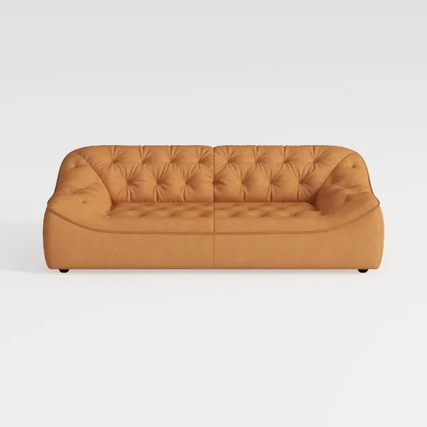 Drawing inspiration from mid-century modern design, this sofa marries retro charm with contemporary warmth, embodying a sense of timeless comfort. Its soft terracotta upholstery, a rich, earthy hue, exudes coziness, while the subtle tufting across the back and seat adds intentional texture—each button creating gentle dimples that invite both the eye and the hand. The silhouette is a study in softness: rounded arms flow seamlessly into the gently curved back, and the generously deep seat, paired with a plump, supportive cushion, feels like a welcoming hug, promising hours of relaxed lounging.