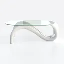 Inspired by natural fluidity, this home piece features a smooth, transparent glass top and sleek, curving white base. Organic S-shaped legs add dynamic movement, contrasting glass and white for modern elegance. Ideal for minimalist living rooms, pairs with neutral sofas and metallic accents, offering ample space for decor.