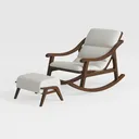This elegant rocking chair and ottoman set draws inspiration from the timeless allure of Scandinavian design, where functionality meets soft minimalism. The warm, sandblasted oak frame—with its gently curved arms and low-slung rocking base—blends organic movement with structural stability, evoking the calm of a sunlit cabin or a quiet reading nook.