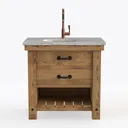 A 3D model of a Bathroom Cabinet Set, featuring wooden cabinet, marble countertop, and copper faucet, with a rustic aesthetic. It has highly detailed design and is suitable for bathroom use.