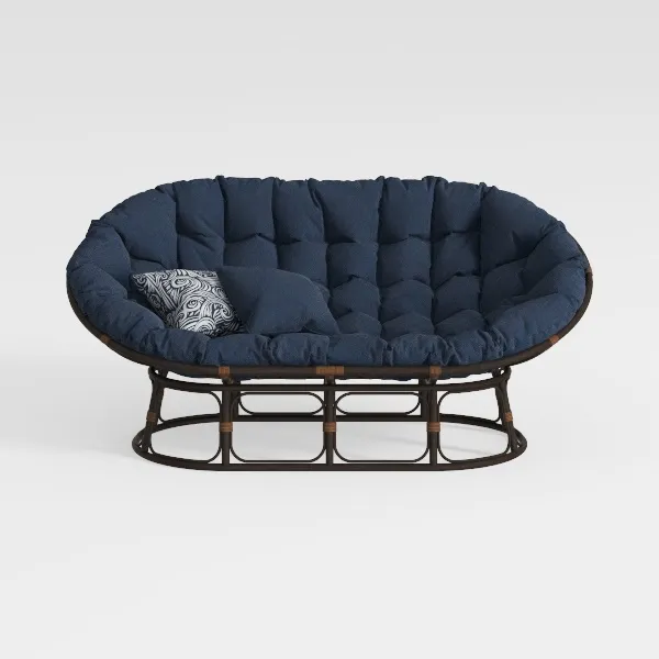 This cozy, rounded sofa draws inspiration from the organic curves of natural forms—think the gentle arc of a crescent moon or the smooth contours of a seashell—blending softness with structural elegance. Its deep navy upholstery, adorned with precise tufted detailing, feels sumptuously tactile: cotton-blend fabric yields gently to the touch, while the dark metal frame, with its warm, oxidized finish, adds subtle contrast, balancing the plushness of the cushions. The rounded silhouette softens the room’s angles, creating a sense of calm and warmth, with the rich blue hue grounding the space and the frame’s geometric lines offering quiet visual interest.