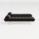This piece draws inspiration from the timeless allure of mid-century modern design, blending clean lines with functional elegance to create a statement piece that transcends trends. The deep, plush cushions, upholstered in a rich, matte black fabric, balance softness and structure—their tufted texture adds subtle visual interest while ensuring a sumptuously comfortable feel, inviting relaxation at first touch. The sleek, polished metal frame, with its slender, angular legs, contrasts gently with the warm weight of the upholstery, infusing the design with a modern edge that feels both sturdy and refined.