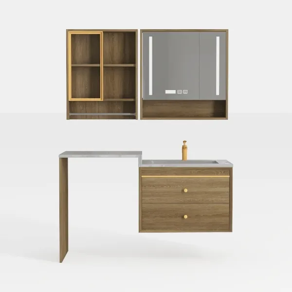 A 3D model of a Bathroom Cabinet Set, featuring marble countertop, dark ribbed panels, and metal faucets, with a modern minimalist aesthetic. It has high detail and is suitable for bathroom decor and interior design display.
