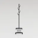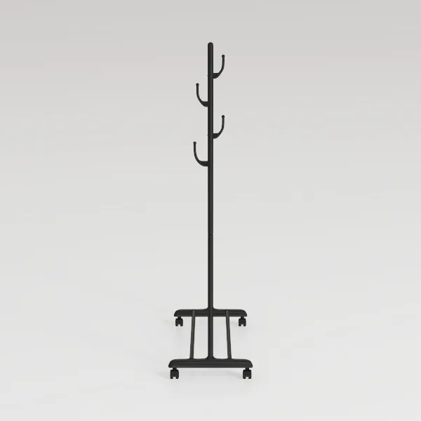 Inspired by minimalist functionality, this sleek coat rack blends practicality with modern aesthetics. Crafted from matte black metal, its vertical design features multiple hooks for coats, bags, and scarves, while smooth-rolling wheels ensure easy mobility. The clean lines and cool, polished surface add a touch of understated elegance, making it ideal for modern, Scandinavian, or industrial entryways, bedrooms, or living room corners.
