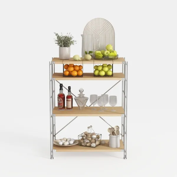 Designed to blend natural warmth with practical storage, drawing inspiration from daily home life and fresh, organized spaces. Warm wooden shelves contrast sleek metal frames, offering a tactile mix of smooth wood and cool metal, with soft lighting highlighting vibrant fruits, potted greens, and neatly arranged kitchenware. Ideal for modern minimalist kitchens or dining corners, it pairs beautifully with marble accents and ceramic decor, enhancing cozy moments. Sturdy metal supports and multiple tiers maximize storage—from fresh produce to bar essentials—ensuring both style and functionality in home spaces.