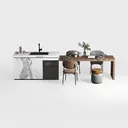 Inspired by the blend of natural textures and modern minimalism, this kitchen setup features a sleek marble countertop with a smooth, cool touch, paired with a warm wooden table. Soft wood grain and delicate metal accents add subtle depth, while the neutral palette (black, white, gray, wood) creates a harmonious, clean look. Ideal for a contemporary or minimalist dining space, it pairs well with metallic lighting and greenery. The spacious countertop offers ample storage, and comfortable chairs enhance a cozy, functional dining experience.