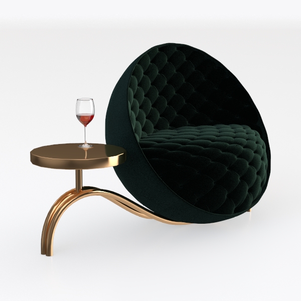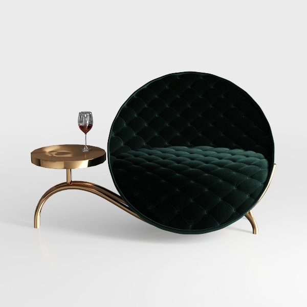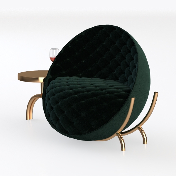 Introducing a stunning seating piece that seamlessly blends elegance and comfort. The design inspiration draws from modern luxury, showcasing a deep green upholstery that exudes sophistication. The soft, tufted texture invites relaxation, while the gentle curves of the seat create a visually pleasing silhouette that enhances any space.