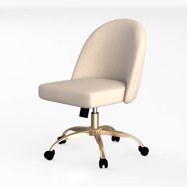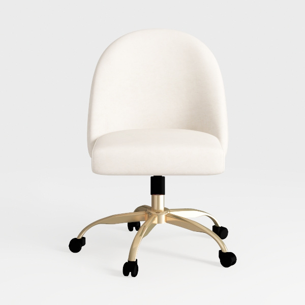 The seat, draped in a buttery off-white upholstery, offers a tactile experience of gentle softness—plush yet supportive, like sinking into a cloud, with a subtle texture that enhances comfort during long hours of use. Contrasting this warmth, the five-point base shimmers in polished gold, its angular legs adding a touch of geometric precision that elevates the visual appeal. The black casters, smooth and matte, provide a sleek contrast to the metallic sheen, ensuring easy mobility across various floor types without marring surfaces.