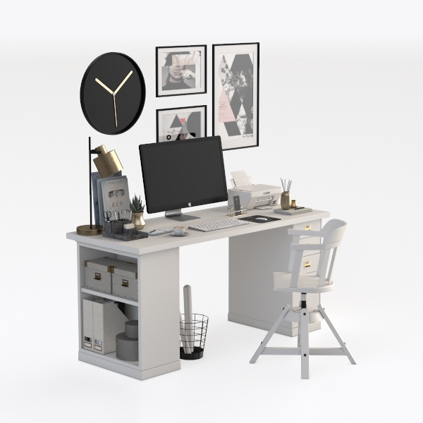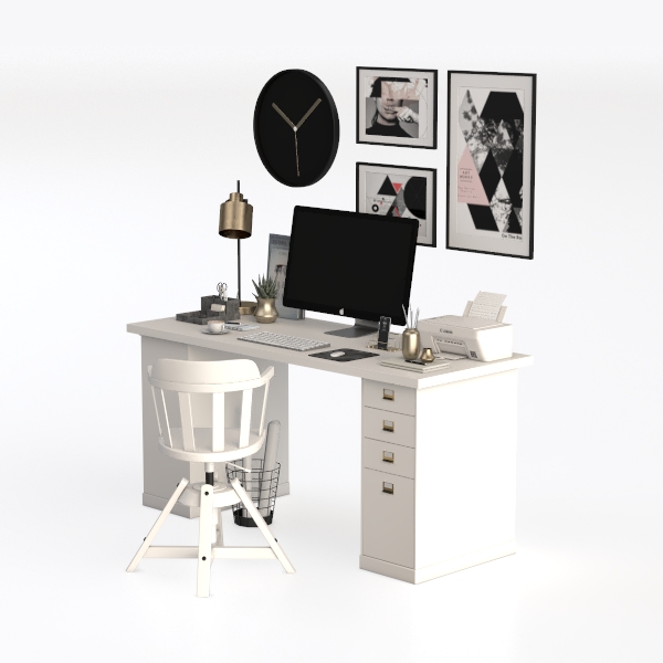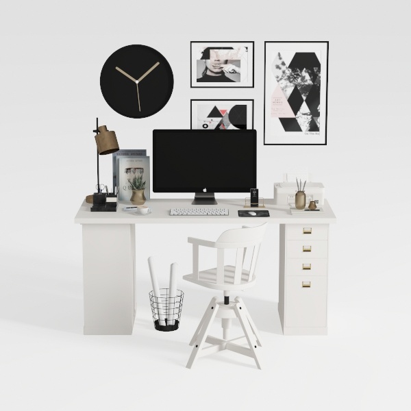 Perfect for a modern home office or study nook, this setup thrives in spaces where productivity meets aesthetics. Its neutral palette—whites, blacks, and muted grays—easily adapts to various decor styles, from contemporary to minimalist, and pairs well with natural wood accents or subtle metallic touches (like the brass desk lamp and pen holder) for added sophistication.