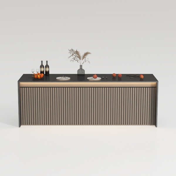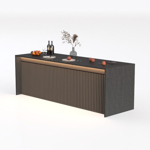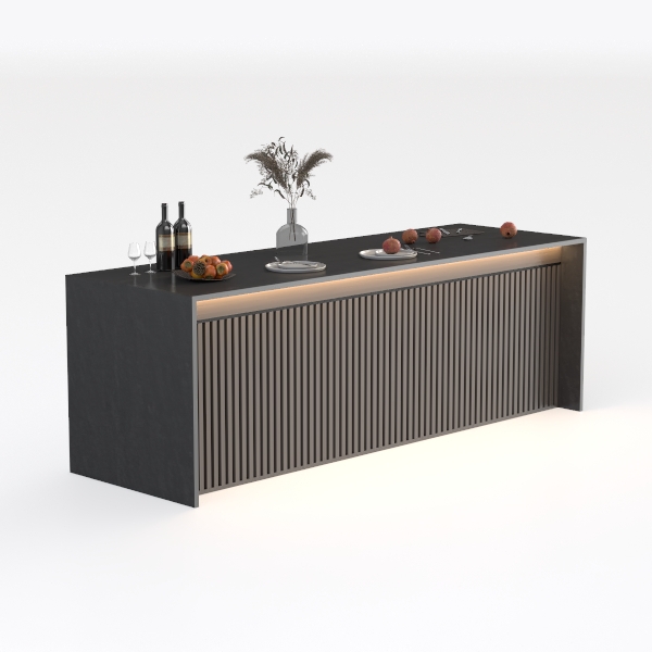 Inspired by the interplay of linear architecture and organic textures, its design draws from the clean lines of minimalist interiors, reimagined through subtle depth. The lower paneling, with its vertical ribbed pattern, echoes the rhythm of architectural columns, adding a grounded, structured presence, while the smooth, dark-toned countertop glides into view like a polished slab of stone—cool to the touch yet warm in its depth.