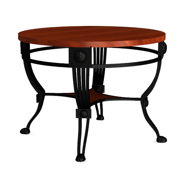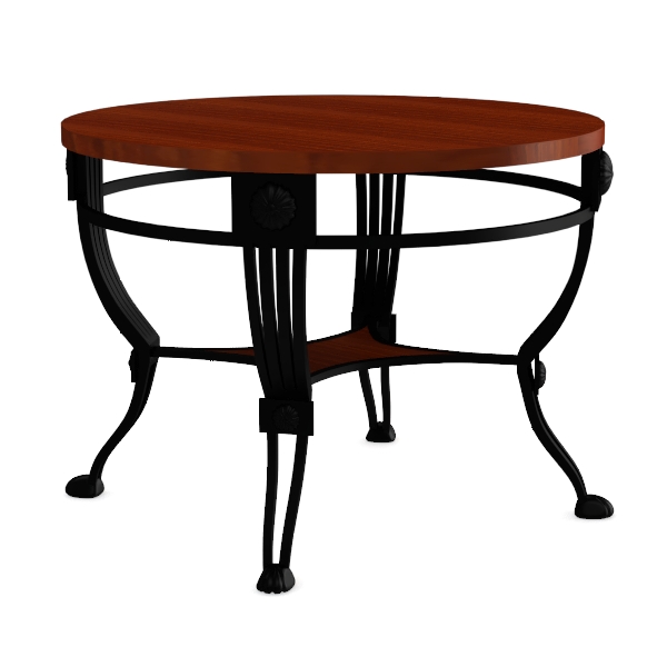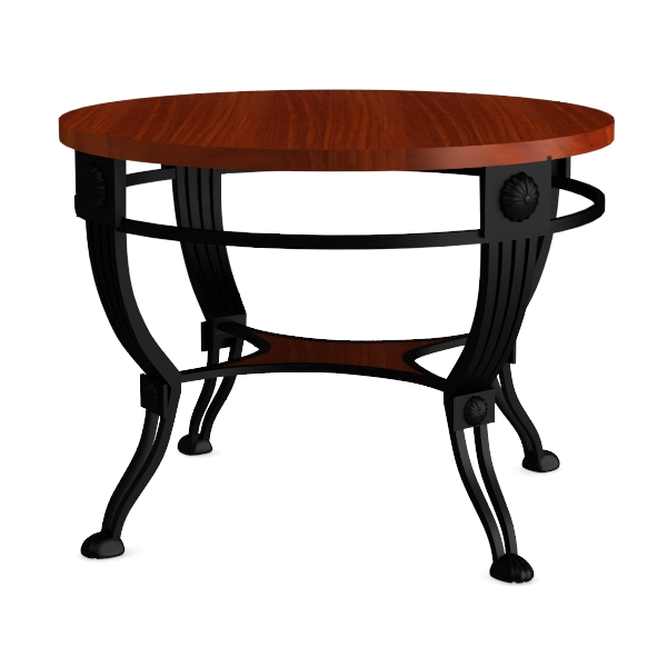 This elegant table, a harmonious blend of timeless design and practicality, draws inspiration from the interplay of organic curves and structured precision, merging 19th-century craftsmanship with a modern touch. The round tabletop, crafted from polished wood, features warm, rich brown hues with smooth, visible grain patterns that invite gentle touch, exuding a natural, earthy warmth. Contrasting this, the black metal frame—adorned with subtle floral motifs and gracefully curved legs—adds vintage charm and robust stability, its matte finish complementing the wood’s soft sheen to create a visually balanced piece.