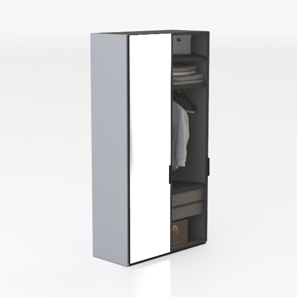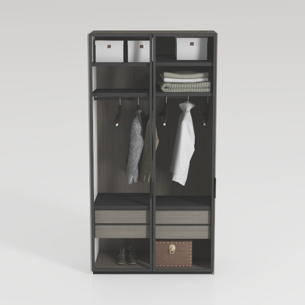 Perfect for contemporary or Scandinavian-inspired bedrooms, it harmonizes effortlessly with soft-toned bed linens, light wooden flooring, and woven textiles, enhancing the room’s calm, uncluttered atmosphere. Below, a lower shelf neatly holds pairs of shoes, while a vintage-inspired leather trunk at the front adds a touch of timeless charm, balancing the modern simplicity. Above, open cubbies with linen-lined boxes keep folded sweaters and scarves organized, while two hanging rods accommodate dresses, shirts, and coats, ensuring garments stay wrinkle-free. With its thoughtful blend of storage solutions and aesthetic appeal, this wardrobe isn’t just furniture—it’s a statement of intentional, beautiful living.