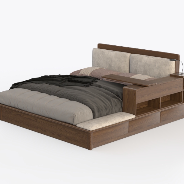 Visually, the frame exudes simplicity with clean, unadorned lines; the headboard’s gentle curve softens the room’s angles, while the neutral palette of wood and gray creates a calm, airy atmosphere, making the space feel open and serene.